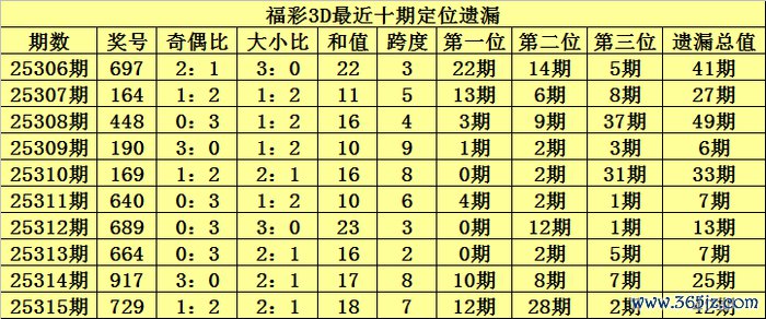 开奖总结:福彩3D第2025315期奖号:729,百位号码遗漏12期、十位号码遗漏28期、个位号码遗漏2期,遗漏总值为42期。